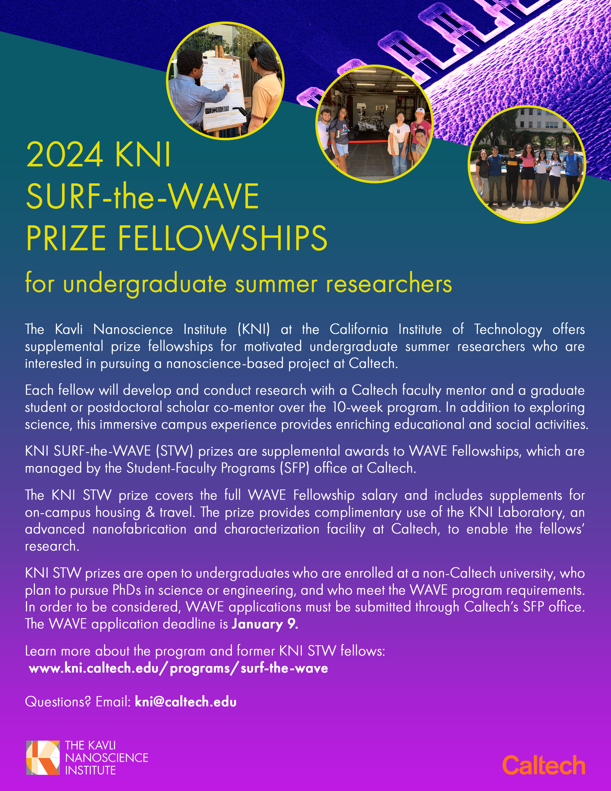 The Kavli Nanoscience Institute established the SURF-the-WAVE (STW) Prize Fellowships program to provide opportunities for motivated undergraduates who are interested in carrying out nanoscience-based research projects during the summer at Caltech. In partnership with the Student-Faculty Programs (SFP) office and its WAVE summer program, KNI STW Prize Fellowships are awarded to undergraduates at non-Caltech colleges or universities who plan to pursue PhDs in science or engineering.