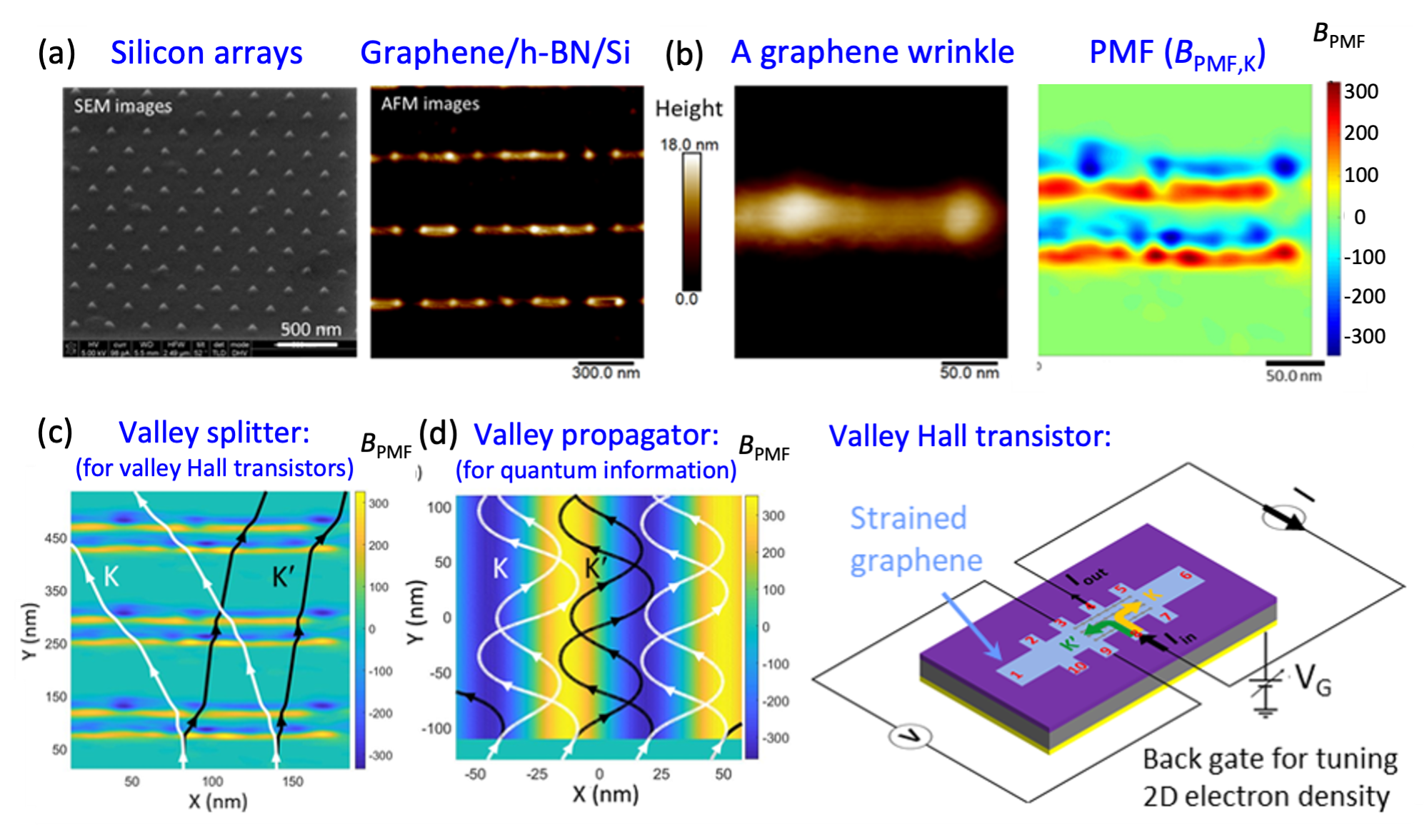 For example, the Yeh group has established a new paradigm of quantum straintronics for controlling the 2D electronic correlation and bandstructures of single layer (SL) graphene via nanoscale engineering of the underlying SiO2/Si substrate, which leads to periodic graphene wrinkles with controlled patterns and strengths of strain that induces spatially varying giant pseudo-magnetic fields (PMF, see Figure 1) and fundamentally alters the electronic properties of monolayer graphene from valley-degenerate massless Dirac spectrum to valley-splitting flat band correlated electrons.[1,2] Emerging quantum phenomena from the valley-Hall transistors fabricated from such strained SL-graphene (see Figure 2 for exemplifying devices) have been discovered.