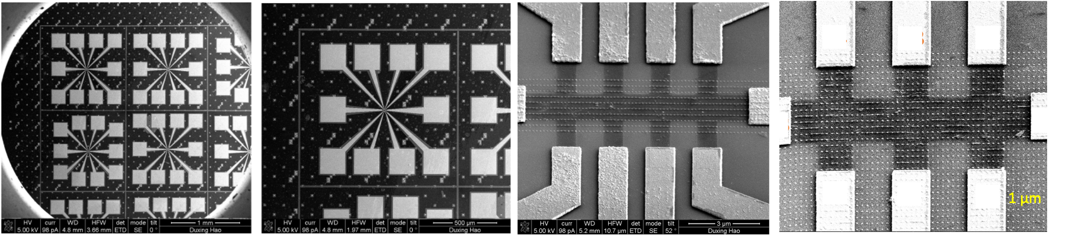 Figure 2: SEM images of different valley Hall transistors fabricated on the same piece of strained SL-graphene by e-beam lithography. The scale bars for the SEM images from left to right are 1 mm, 500 μm, 3 μm and 1 μm.